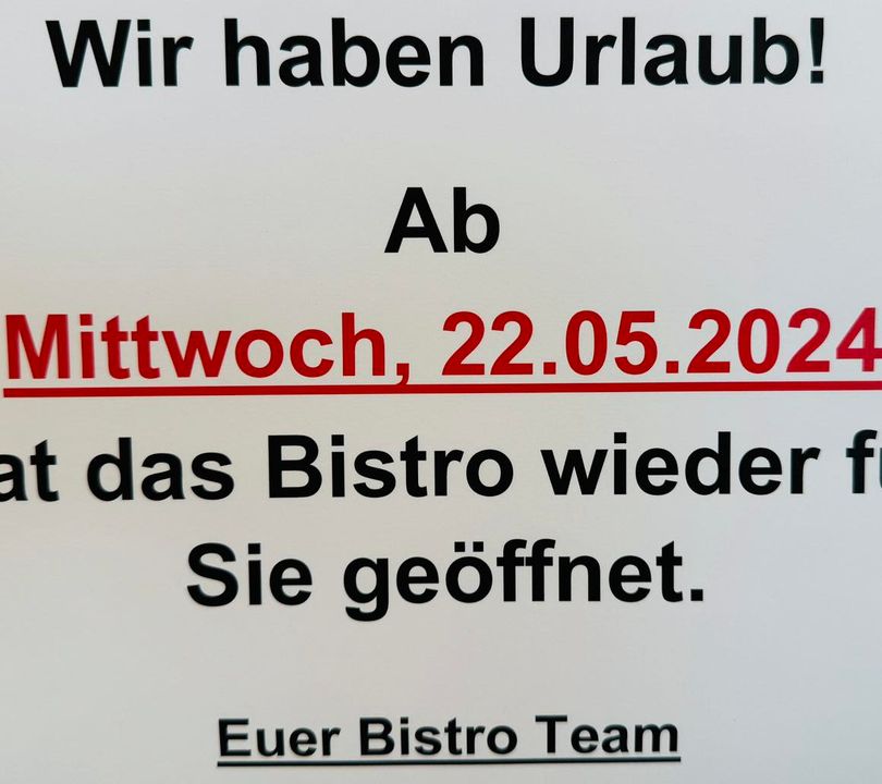 Wir schließen heute um 18:00 Uhr unser Bistro.