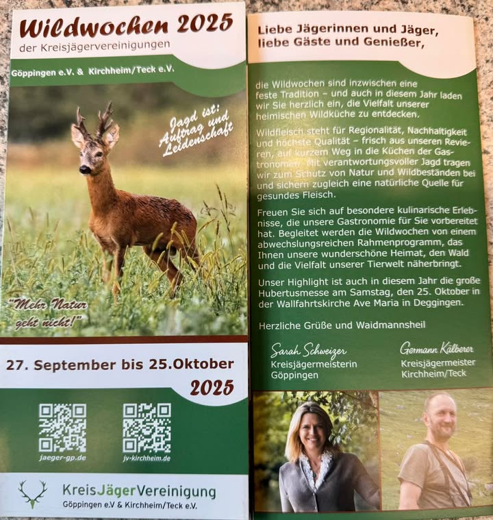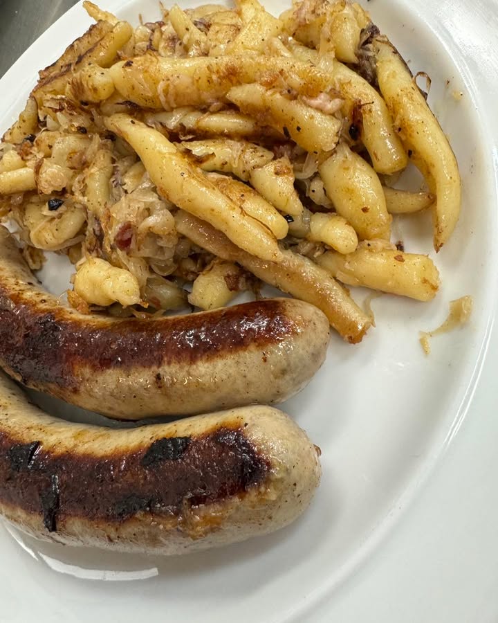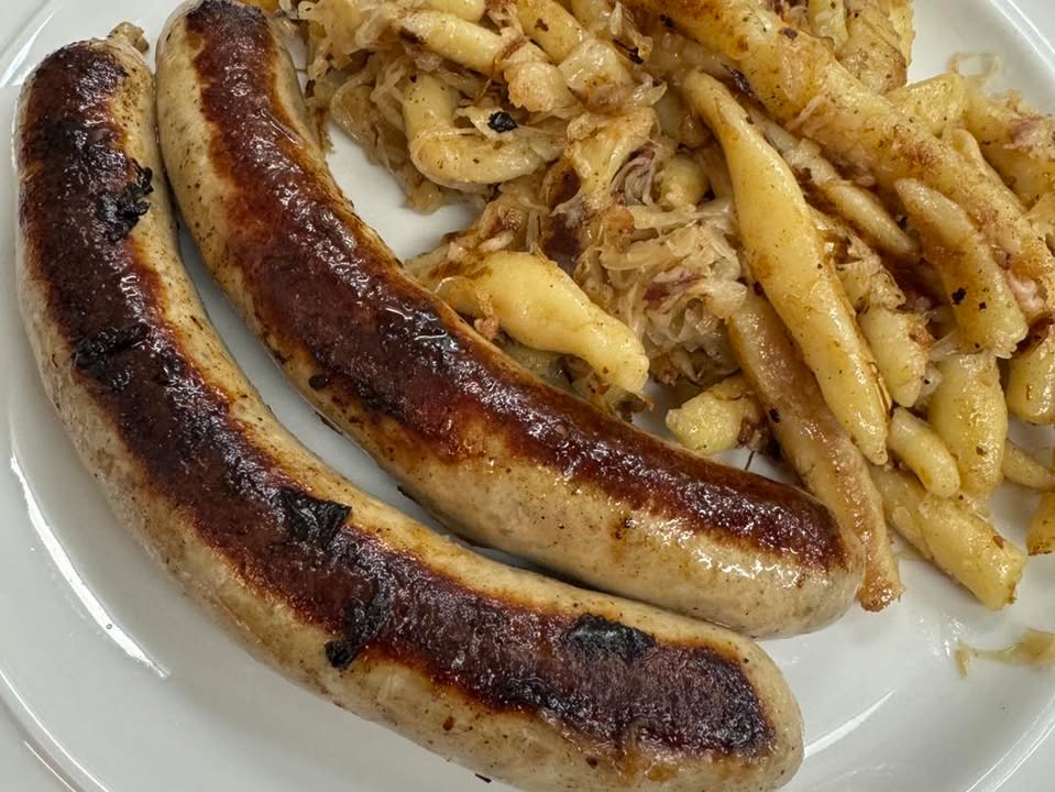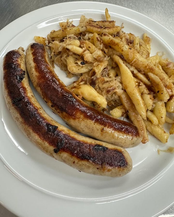 Hirschburger mit Camembert und Preiselbeeren und Wildschwein-Bratwurst mit Sauerkraut solange der Vorrat reicht