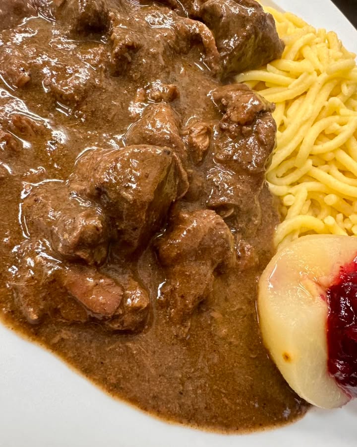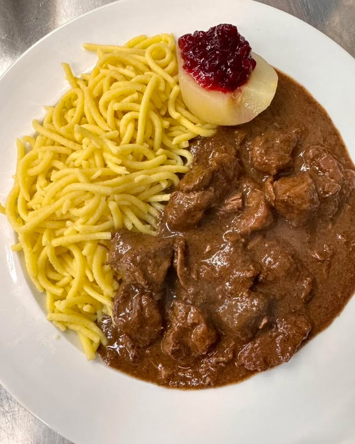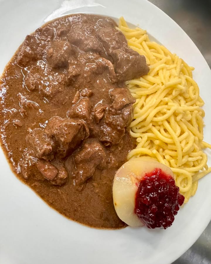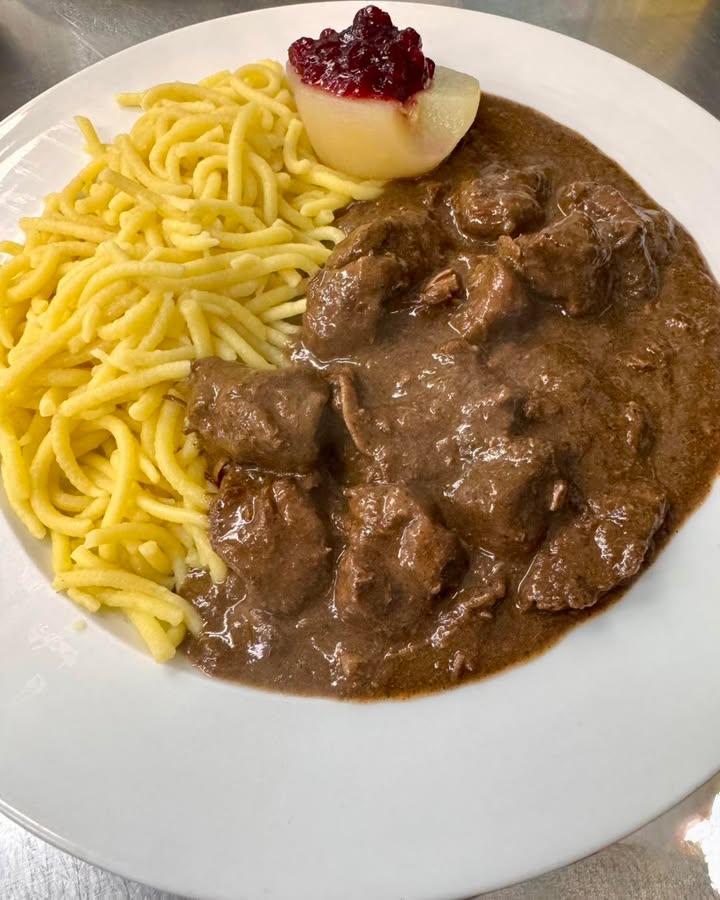 Wildgulasch mit Spätzle und Preiselbeeren.