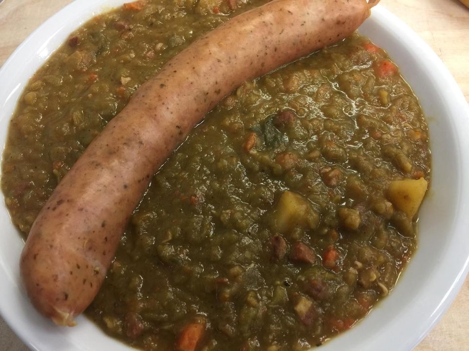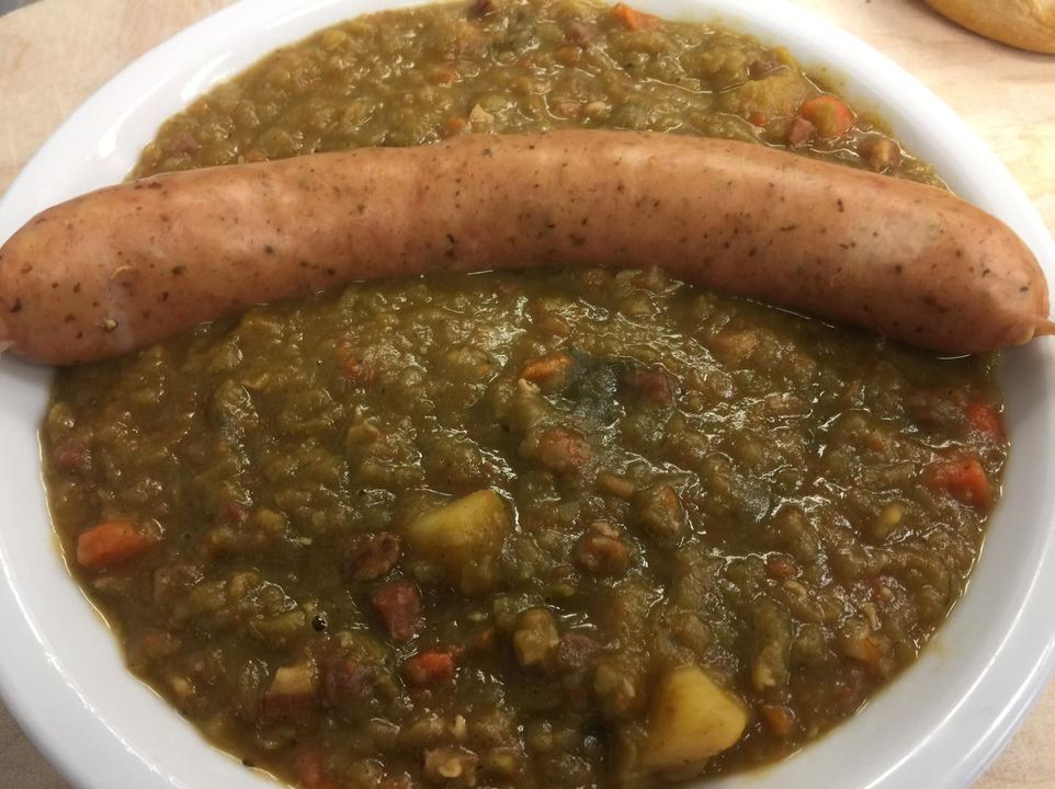 Hausgemachter Erbseneintopf nach unserem Feldküchenrezept mit Wurst und Brot