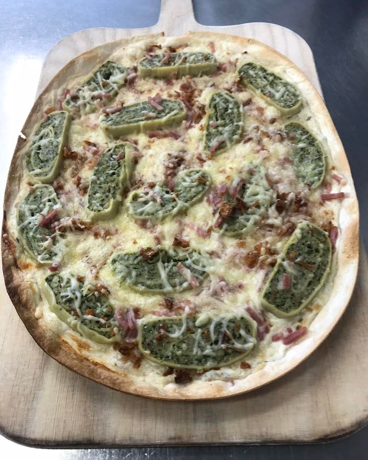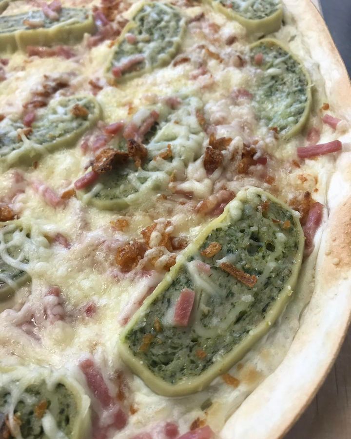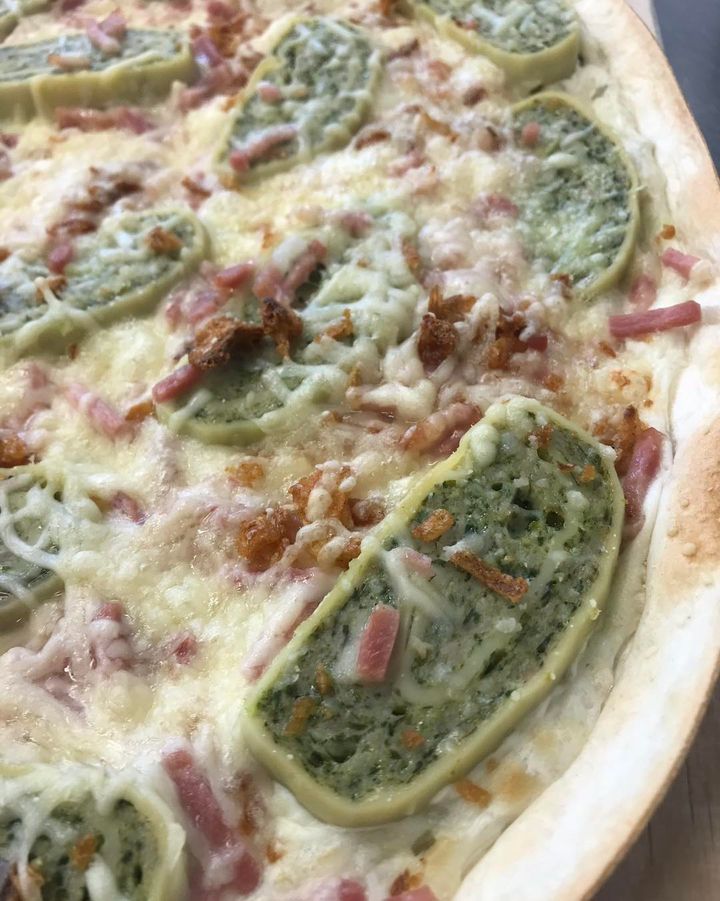 Schwäbischer Flammkuchen mit Maultaschen, Speck und Röstzwiebeln.