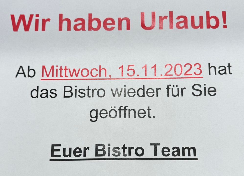 Unser Bistro hat auch am Mittwoch, 1. November von 11:30 Uhr bis 19:30 Uhr für Sie geöffnet. Um 17:00 Uhr spielen unsere Frauen 1 gegen Frisch Auf Göppingen, verpassen Sie das Derby nicht!