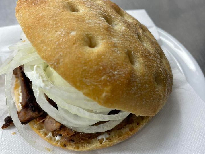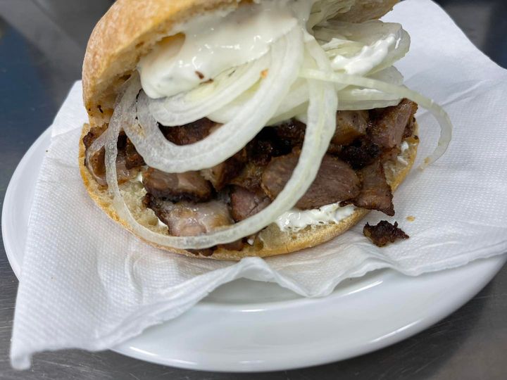 Gyros im Brötchen mit Zwiebeln und Zaziki
