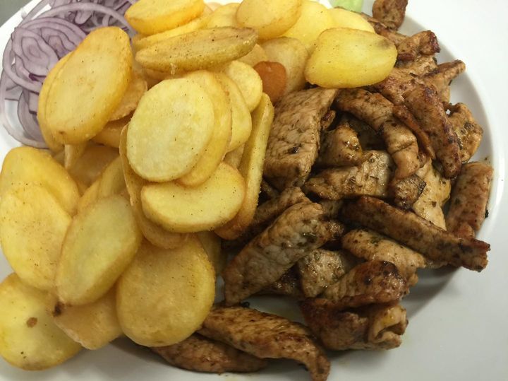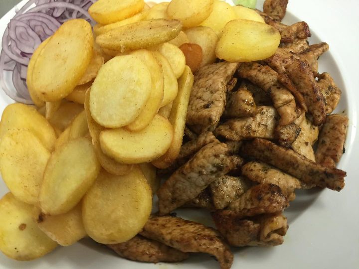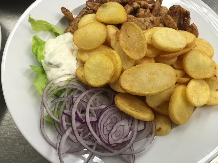 Pfannengyros mit Pommes oder Kartoffelscheiben dazu Zaziki und Zwiebel.